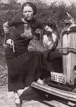 Frank Hamer never crossed paths with Bonnie and Clyde prior to the final ambush. Blanche (played by Estelle Parsons) was very upset at her portrayal after seeing the movie … she claims to have not been such a lunatic. The CW Moss character is actually an amalgam of drivers affiliated with the gang. Also, there is no mention of the horrible accident that left Bonnie’s legs badly burned … to the point where Clyde had to carry her everywhere those last few months. Pictured left is the famous photo of Bonnie with cigar and gun.