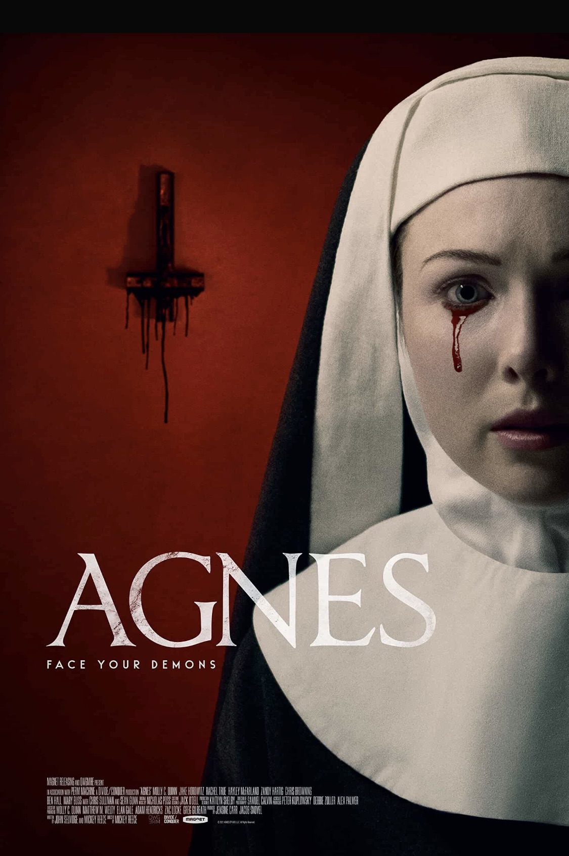 Hayley McFarland (THE CONJURING, 2013) plays the titular Sister Agnes, and her outburst during a group meal with her fellow nuns startles us, and leads the Mother Superior (Mary Buss) to request assistance from the Catholic Church to address what appears to be demonic possession of Agnes. Chosen for the mission are a contrasting oddball pair of priests. The young, full of faith, not yet ordained Benjamin (Jake Horowitz, THE VAST OF NIGHT), and the elder, cynical, soon-to-be-banished Father Donaghue (Ben Hall) are sent to administer the exorcism … a process that Father Donaghue views as a convenient “out” for the one suffering.