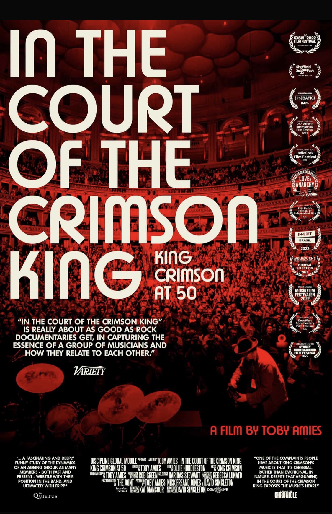 Greetings again from the darkness. King Crimson was founded in 1969 and to this day, no one can properly describe their music. Even co-founder and band leader Robert Fripp avoids labeling the music and instead states, “King Crimson is a way of doing things”. Documentarian Toby Amies takes on the challenge of examining the band after 50 years.