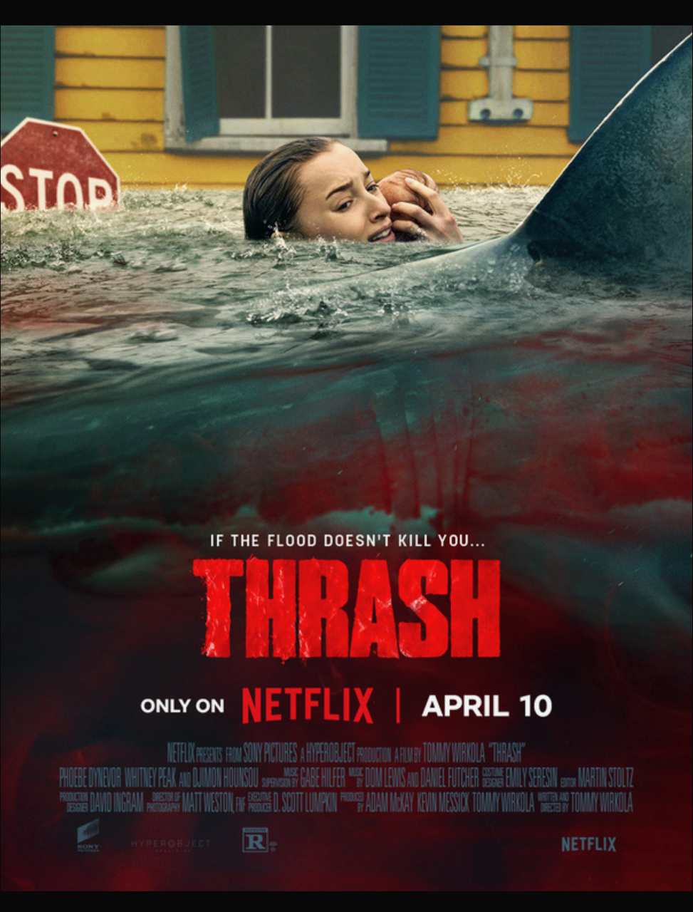 A massive hurricane, along with the storm surge, flooding, and high winds is not enough this time. Along with all of that comes bull sharks and great whites that are swimming (and eating) their way through the town, including the flooded houses. A t-boned meat truck dumps a ton of blood in the streets to ensure we have enough shark attacks to keep these stragglers in danger. Dakota and Lisa share a story, while three foster kids just outside of town get their own – although for the three kids, it turns out their foster parents may have been the real sharks.