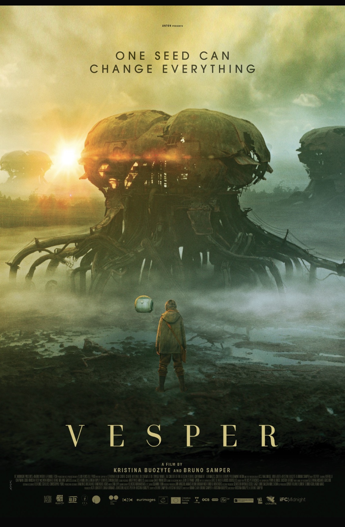 Raffiella Chapman plays Vesper, a 13-year-old forced to survive off the shredded land while also playing caregiver to her disabled father (Richard Brake). She manages his feeding tube and is followed around by the drone through which he calmly communicates … the floating drone looks a bit like Wilson the volleyball. Vesper is also a bit rebellious and exceedingly clever and intelligent. We first see her scavenging the land for anything useful in feeding Papa or furthering her experiments in her self-made lab located in their own cabin in the woods.